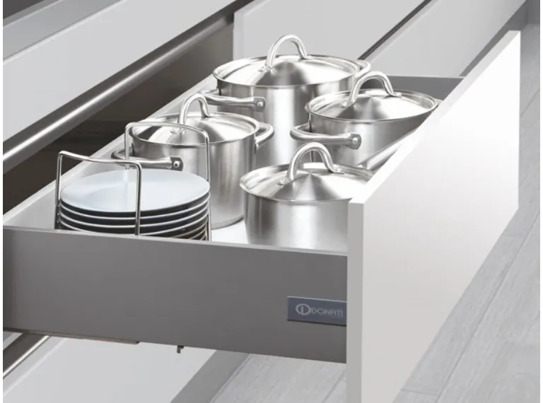Slimbox di Donati è il nuovo cassetto metallico stretto, spessore 13 mm, dal design contemporaneo, munito di guide sincronizzate sia in versione soft-closing che push-to-open. Il valore aggiunto conferito dalle guide sincronizzate risiede nell’ottima scorrevolezza e nella silenziosità di funzionamento. Anche per il cassetto Slimbox è disponibile la maniglia 3D che permette non solo l’aggiustaggio del frontale in tre dimensioni, ma anche il montaggio (o smontaggio) del cassetto semplice e veloce.